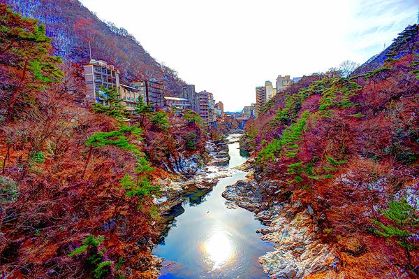 鬼怒川溫泉⋯⋯和上游的川治溫泉之間有長約 3 公里的龍王峽溪谷。這裡分佈著許多瀑布和奇岩,修建起一條龍王峽自然研究路,遊人可以一邊散步一邊觀賞雄渾壯美的景色。另外,還可以坐船,花 40 分鐘順鬼怒川急流而下,沿途可眺望高達 100 米的峭壁,尤其是秋天的紅葉季節,這裡的觀光客絡繹不絕。