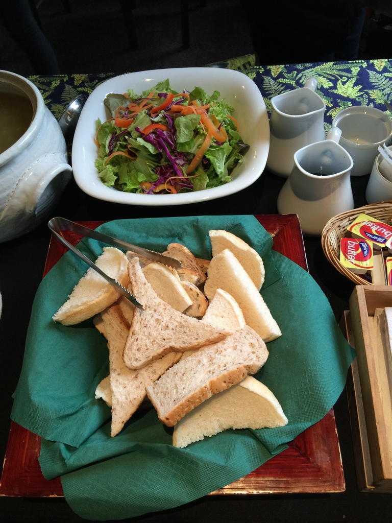 生野菜莎拉搭配油醋醬夠味,純麥麵包也可配濃湯喝~